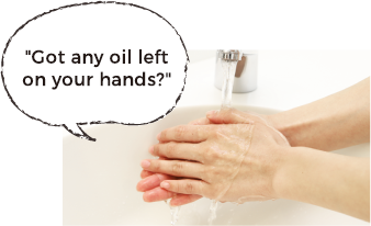 By rinsing the oil off your hands first, you can emulsify quickly and thoroughly.