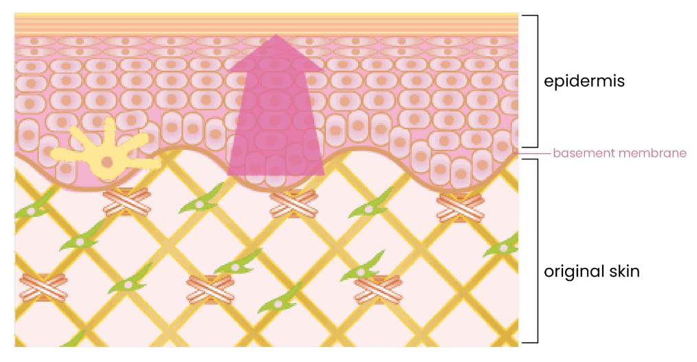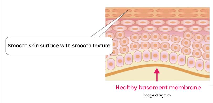 The basement membrane is a thin layer with a thickness of about 0.1 micrometers located at the border of the epidermis and the dermis. The basement membrane serves as a supportive structure to maintain the health of the underlying skin cells and the basal cells that play a role in producing the cells of the stratum corneum. It also plays a role in the information exchange, such as the exchange of nutrients and waste between the epidermis and dermis. Simply put, the basement membrane is an important presence similar to a "control tower."