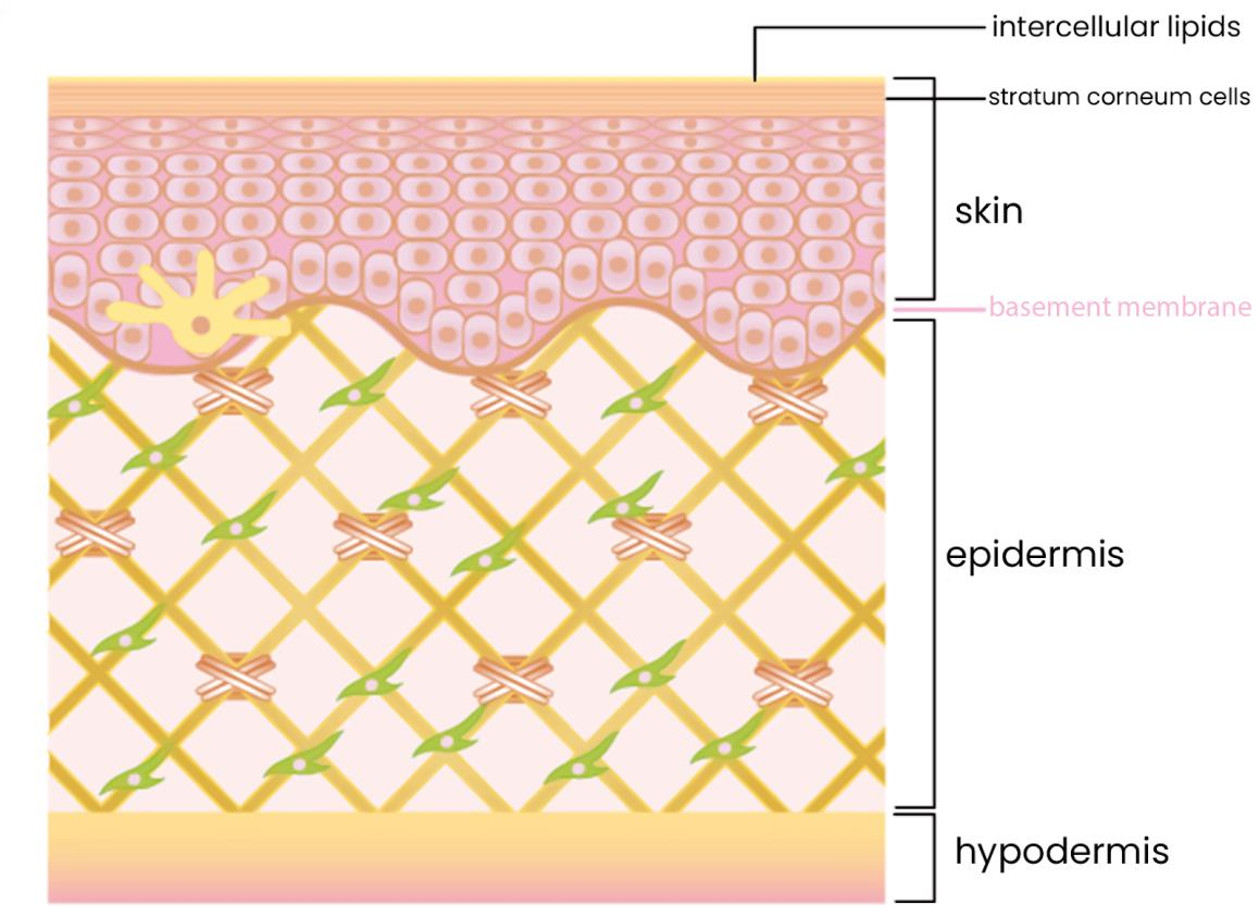 The basement membrane is a thin layer with a thickness of about 0.1 micrometers located at the border of the epidermis and the dermis. The basement membrane serves as a supportive structure to maintain the health of the underlying skin cells and the basal cells that play a role in producing the cells of the stratum corneum. It also plays a role in the information exchange, such as the exchange of nutrients and waste between the epidermis and dermis. Simply put, the basement membrane is an important presence similar to a "control tower."