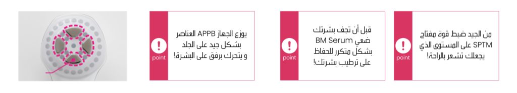 - لكي يعمل الجهاز بشكل فعال، احرصي على ملامسة رؤوس الجهاز للبشرة بشكل صحيح، واضغطي على زر التشغيل. ولزيادة المستوى اضغطي على زر.SPTM