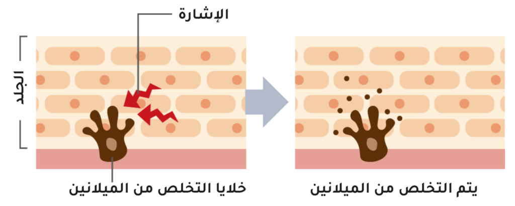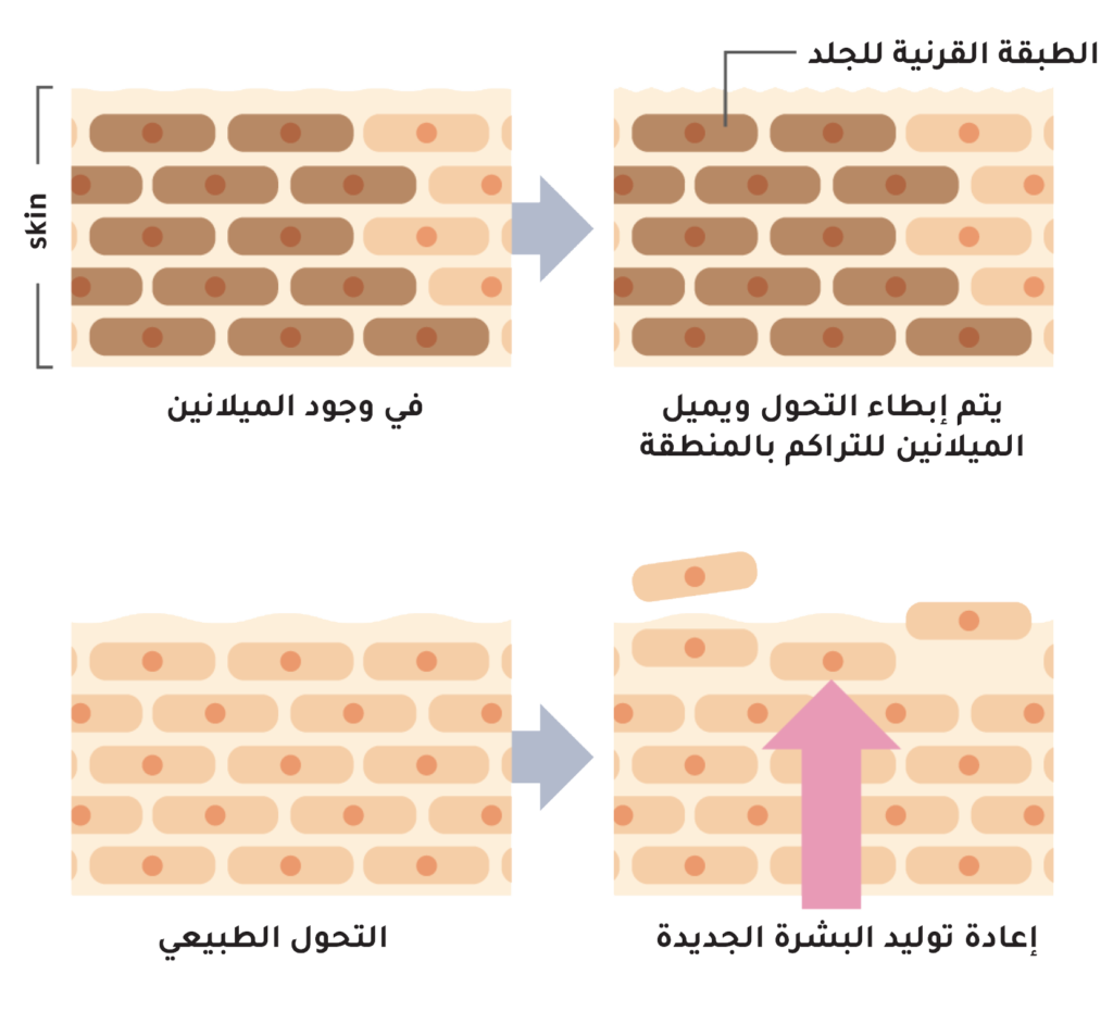 - يثبط إنتاج الميلانين ويمنع ظهور البقع الداكنة والهالات والنمش.
