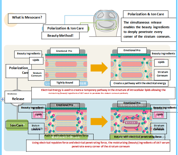 the facial muscles. At the same time, it utilizes the (Mesocare), which relies on electricity to allow the beauty ingredients in the AX7 Serum to penetrate every corner in the stratum corneum. The (Light Care) works to support skin renewal. Another key feature of the EMO PRO device is the ability to achieve a synergistic effect for beautiful skin with each function!